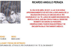 Ciudad de México, 02 Mayo.- La procuraduría de Justicia capitalina activó la Alerta Amber para localizar al joven de 16 años, Ricardo Angulo Pereza, quién desapareció en la delegación Iztacalco entre el cruce de Río Churubusco y Té, colonia Ramos Millán.