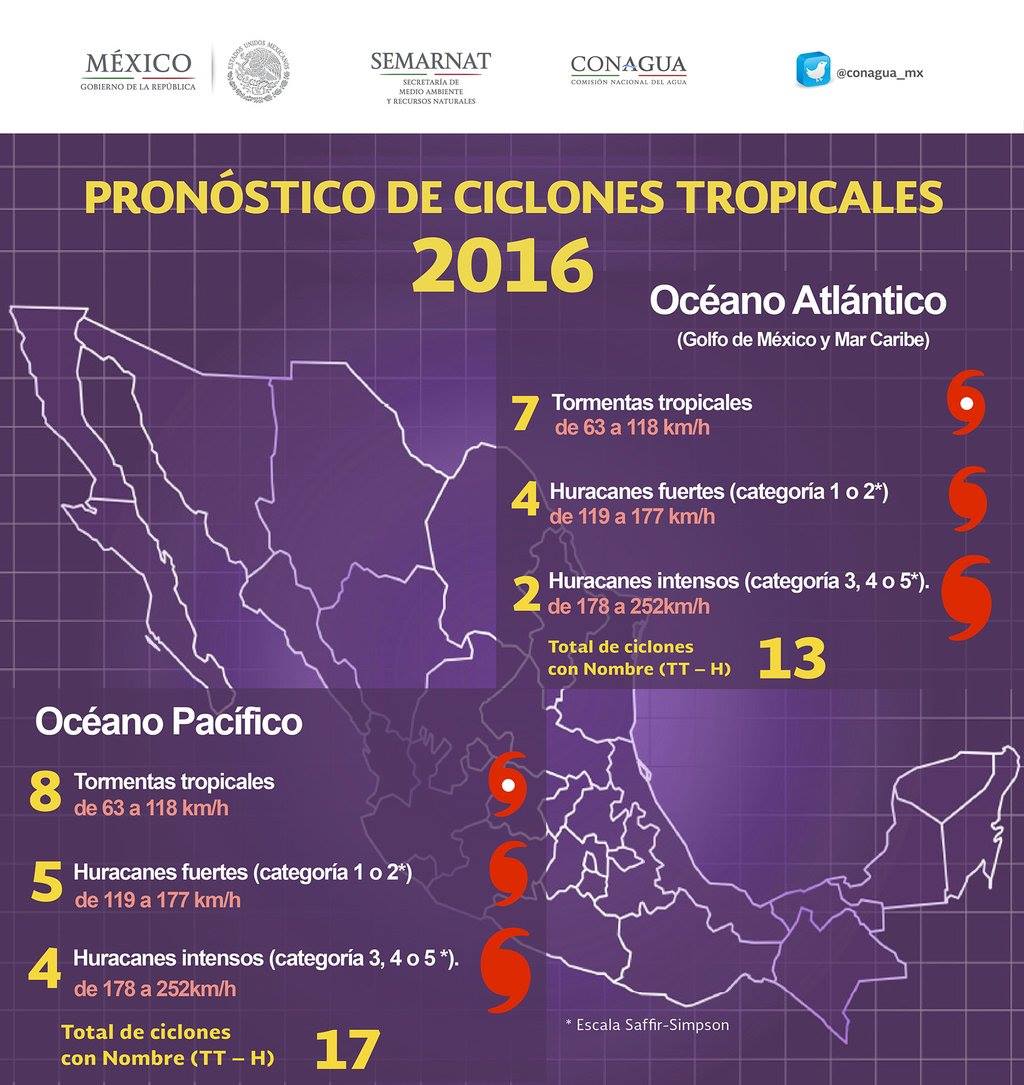 Cuidad de México, 19 May.- El Servicio Meteorológico Nacional informó que para los próximos días, se prevé el inicio de la temporada de ciclones en el país, siendo el Océano Pacífico, el más afectado pues habrán alrededor de 30 ciclones de los cuales, ocho podrían alcanzar la categoría de tormenta tropical, cinco la de huracán fuerte, siendo categorías 1 o 2 en la escala de Saffir Simpson, y cuatro la de intensos, comprendiendo las categorías 3, 4 o 5 en la misma escala.