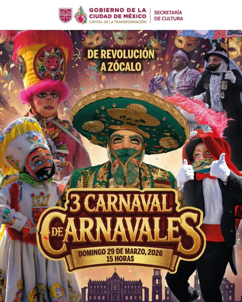 Las comparsas volverán a llenar de color y música el corazón de la capital con la tercera edición del “Carnaval de Carnavales”, una iniciativa apoyara por el Gobierno de la Ciudad de México, a través de la Secretaría de Cultura, que busca celebrar esta expresión declarada como Patrimonio Cultural Inmaterial de la capital en 2024. La cita es el domingo 29 de marzo de 2026 a las15:00 horas en el Monumento a la Revolución.