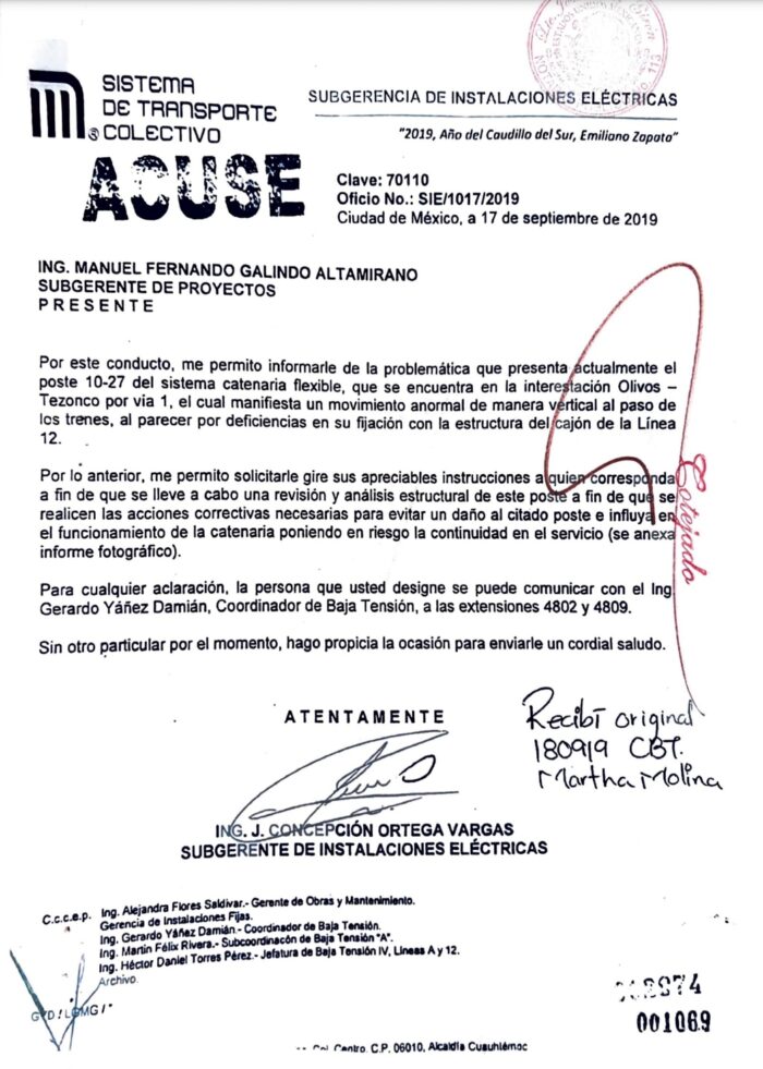 La Subgerencia de Instalaciones Eléctricas del Sistema de Transporte Colectivo – Metro (STC-Metro) advirtió, en un oficio emitido el 17 de septiembre del 2019, al Sugerente de Proyectos del organismo, Manuel Fernando Galindo Altamirano, de una falla existente en el poste 10-27 del sistema de catenaria flexible en el tramo de las interestación Los Olivos– Tezonco.