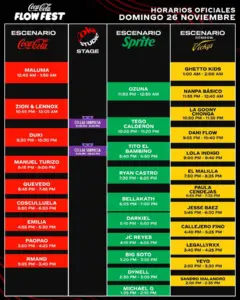 En cuanto al domingo, Michael G abrirá el Escenario Sprite a las 13:35 horas, y el día cerrará con dos shows muy esperados: El de Maluma en el Escenario Coca-Cola, que acabará a la 1:50 horas, y Guetto Kids en el Escenario Dembow Vicky; este cerrará a las 2:00 aproximadamente. Horario completo acá abajo.