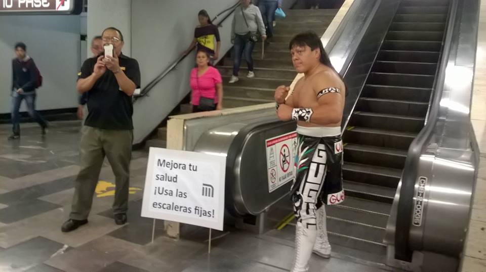 Cuidad de México, 27 May.- Último Guerrero, Gran Guerrero y Edgar Sosa (miembros del Consejo Mundial de Lucha Libre), promovieron el día de ayer en la línea 9 del Sistema de Transporte Colectivo Metro, el uso de las escaleras fijas, con el fin de mejorar la salud de todos los usuarios.