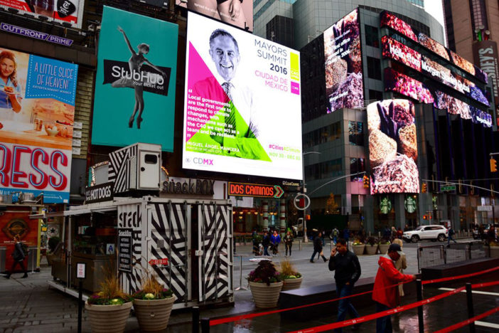Ciudad de México, Nov, 30- Times Square, símbolo de la ciudad de Nueva York que se caracteriza por su animación y por la publicidad luminosa, es el sitio en el que promociona su imagen el jefe de gobierno capitalino, Miguel Ángel Mancera, con motivo de la Cumbre de Alcaldes C40 que se realiza en la Ciudad de México.