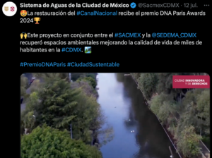 CDMX, a 15 de julio.- Por la recuperación y renovación socioambiental del Canal Nacional, el Gobierno de la Ciudad de México, mediante el Sistema de Aguas de la Ciudad de México (SACMEX) y la Secretaría del Medio Ambiente (SEDEMA), recibió el Premio Internacional DNA Paris Design Awards 2024 en la categoría de Diseño de Paisaje y Desarrollo Sustentable.