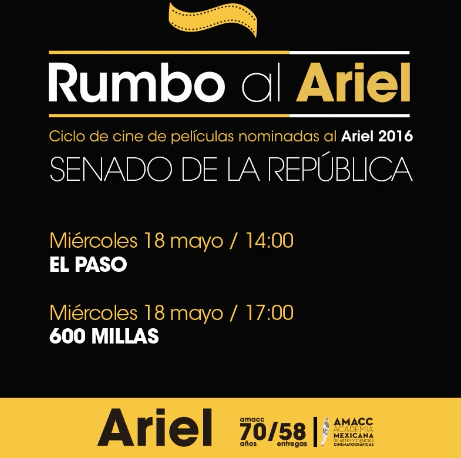 “Rumbo al Ariel”, ciclo organizado por la Academia y el Senador Ríos Piter, está conformado por las películas nominadas por la Academia a obtener el Ariel de este año, que se entregará el próximo 28 de mayo de 2016, en el Auditorio Nacional.