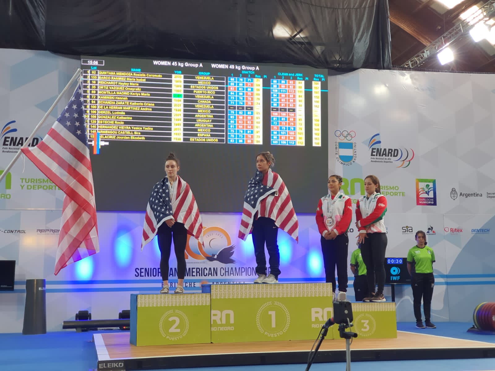 México también contó con doble presencia de mujeres en el podio de los 49 kilogramos, pues Yésica Yadira Hernández Vieyra se hizo de dos bronces con un envión de 101 kg. y total de 182 kg. Andrea de la Herrán Martínez, consiguió el tercer peldaño con un arranque de 85 kg.