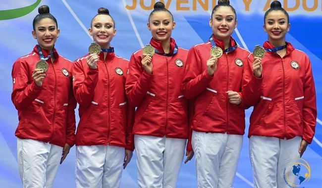 En equipo, Adirem Tejeda, Dalia Alcocer, Kimberly Salazar, Sofía Flores y Julia Gutiérrez, conquistaron el primer lugar en la prueba tres listones y dos pelotas con 33.050 puntos con los que superaron a Brasil (32.400) y Argentina (23.700).