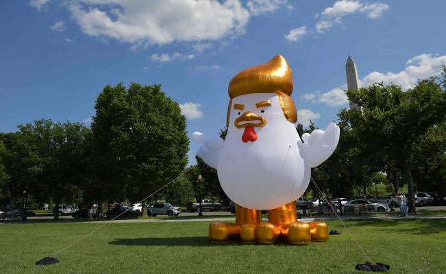 Ciudad de México, 9 Agosto.- Un globo en forma de gallina, con el copete similar al que utiliza el presidente de Estados Unidos, Donald Trump, apareció este miércoles a un costado de la Casa Blanca.
