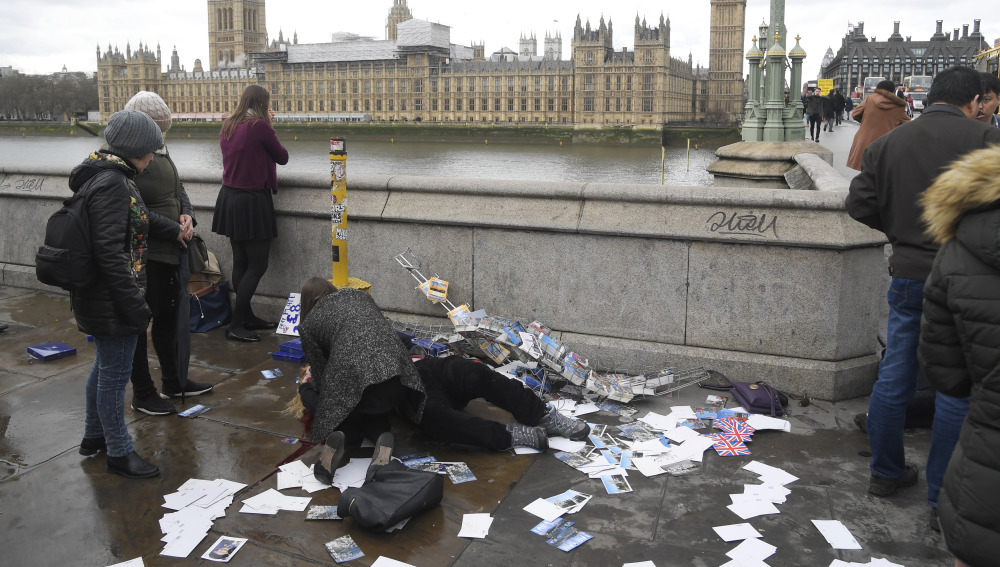 An injured woman is assisted after an incident on Westminster Bridge in London, Britain March 22, 2017. REUTERS/Toby Melville - RTX326V3
