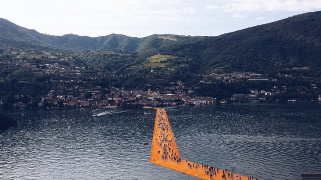 Iseo se encuentra en el norte de Italia, a unos 100 km de Milán y a unos 250 km de Venecia. Hasta el 3 de julio, quienes se acerquen hasta allí van a poder, literalmente, andar sobre el agua. Realmente se camina sobre una plataforma de tres kilómetros de largo compuesta por cubos de polietileno. Al ser un material endeble, la sensación, según el propio artista, no es la de andar sobre un camino pavimentado, sino más bien “sobre la espalda de una ballena”.