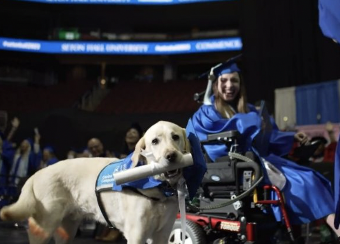 Las cuentas de la Universidad Seton Hall compartieron el video que muestra cuando el presidente del colegio, Joseph E. Nyre, entrega el diploma tanto a la estudiante como al perro de 6 años, mezcla de raza labrador y golden por el triunfo que lograron como binomio.