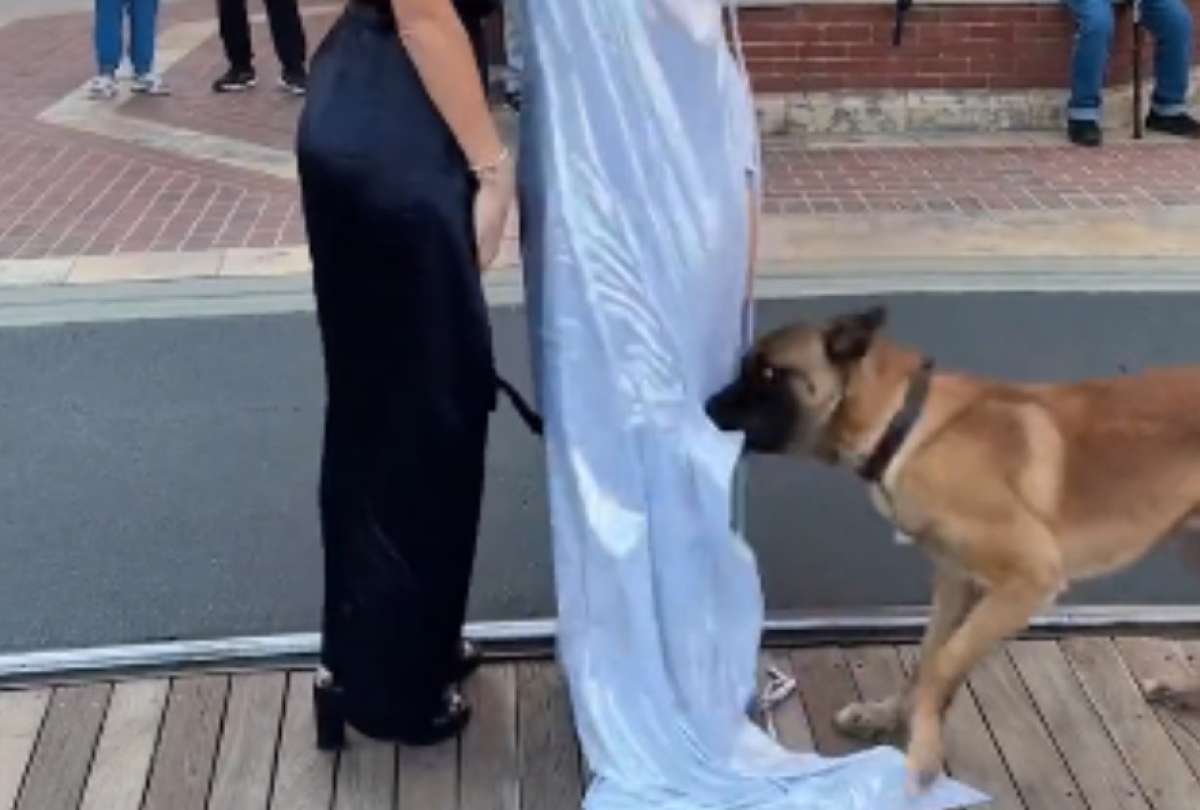 El divertido momento causó risas entre los asistentes, pues fue muy espontáneo, aunque la joven no tuvo que correr mucho, ya que el can llegó directamente con quien parece ser su dueño y le entregó el vestido.