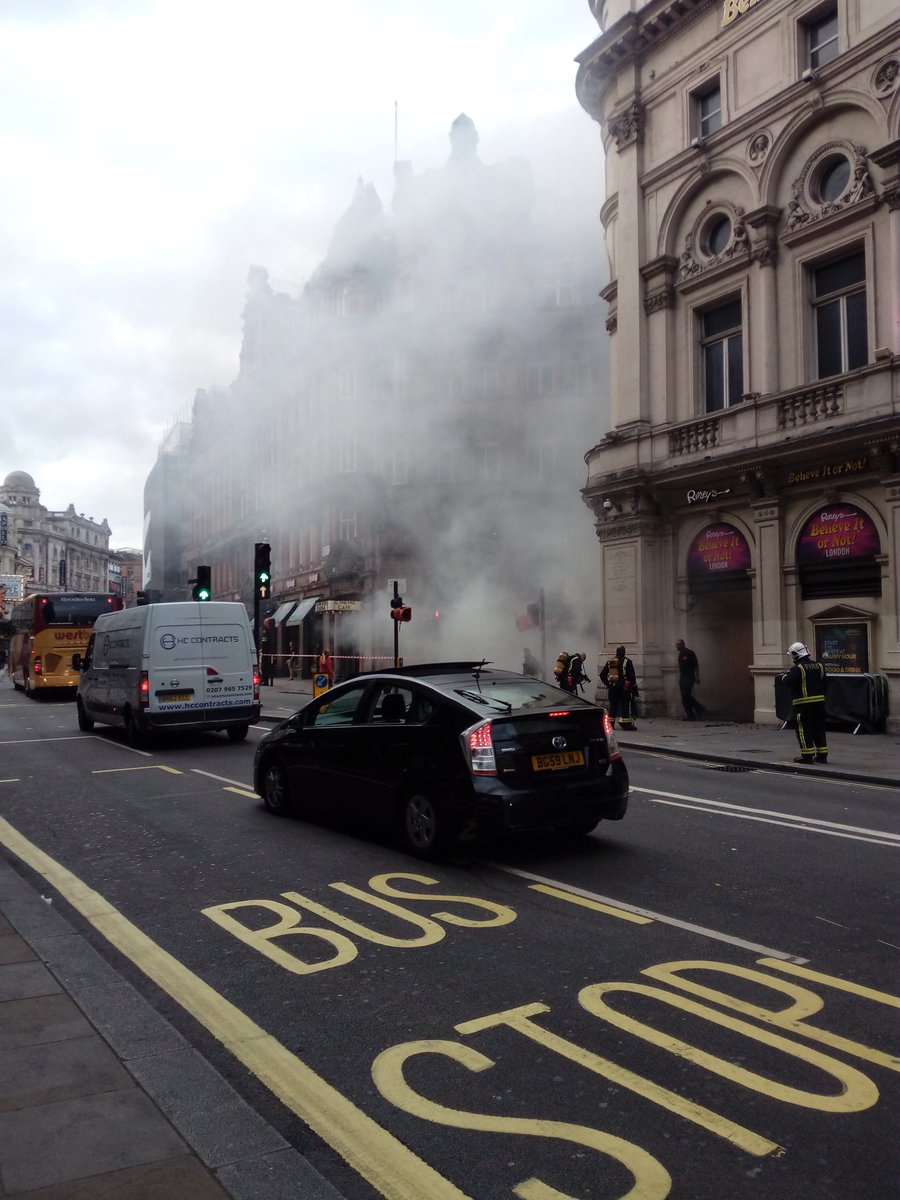 Los primeros datos señalan que el incendio se originó en una calle cercana a Picadilly Circus, donde camiones de bomberos trabajan en mitigar el fuego.