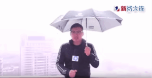 En el video se puede observa que mientras el reportero Lu Xiaodong daba el clima con el micrófono en la mano y la otra en el paraguas, el rayo lo hizo gritar del dolor.