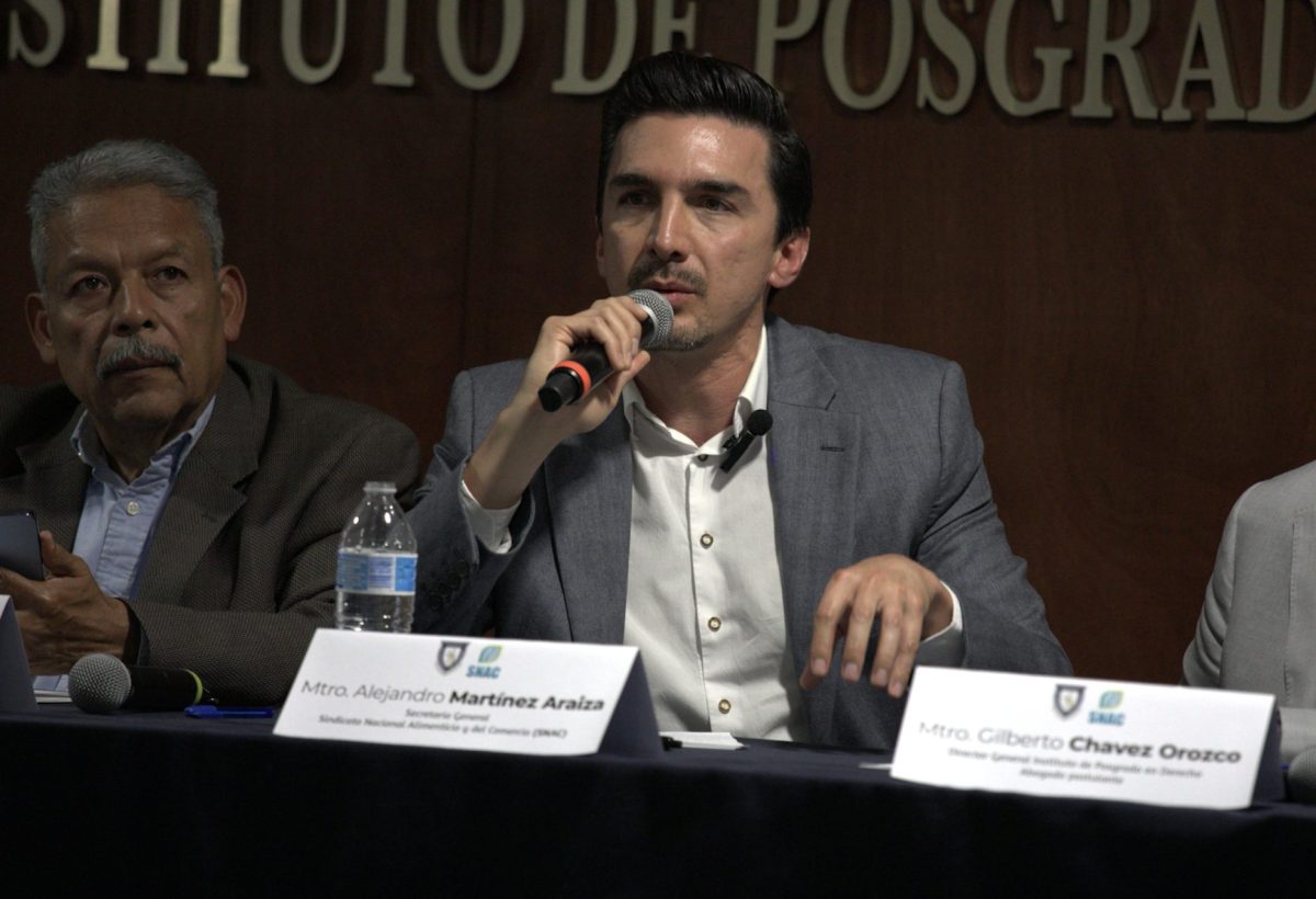 En el panel llevado a cabo por convocatoria del SNAC y el IPD, participaron además de Alejandro Martínez Araiza, la Mtra. Elizabeth Echeverria Manrique, especialista de la OIT; el Lic. Tereso Medina Ramírez, secretario general adjunto CTM Nacional; el Mtro. Gilberto Chávez Orozco, director general del IPD; el Dr. Manuel E. Fuentes Muñiz, asesor jurídico; el Mtro. Ricardo Espinoza López, coordinador nacional de asuntos jurídicos CAT; el Lic. José Humberto Huitrón Atuzar, consultor de derecho colectivo de trabajo; y el Mtro. Óscar de la Vega Castillo, abogado laboral.