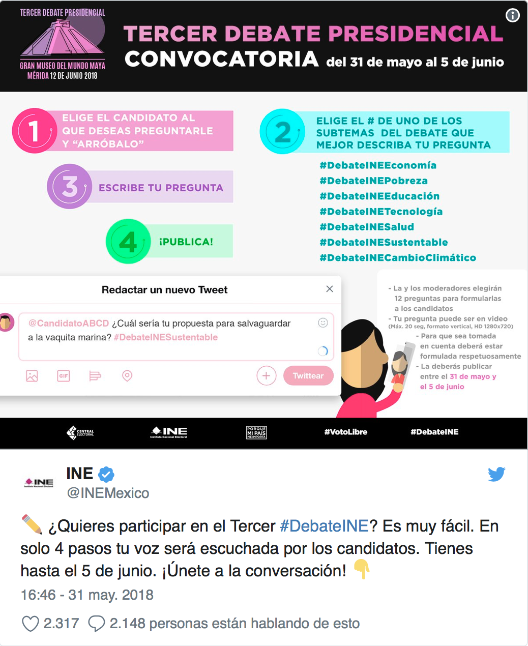 Para recolectar las preguntas, el INE especificó a través de su cuenta en Twitter que los usuarios de esa red deberán formular la pregunta enfocada en esos temas; arrobar al candidato al que quieren preguntarle y utilizar alguno de estos hashtags: #DebateINEEconomía, #DebateINEPobreza, #DebateINEEducación, #DebateINETecnología, #DebateINESalud, #DebateINESustentable y #DebateINECambioClimático.