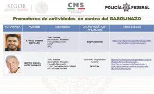 En un análisis criminológico realizado por la División Cientíca de la Policía Federal, a partir de los sucesos del 1 de enero en contra del alza en el precio de las gasolinas, se señala a Mario Delgado Carrillo, senador por Morena; a Gerardo Fernández Noroña; Blanca Amelia Gámez Gutiérrez, diputada en Chihuahua por el PAN; Óscar González Yáñez, diputado en el Estado de México por el PT, y Alfredo Lozoya Santillán, alcalde de Parral, Chihuahua, como los promotores de las marchas y bloqueos a las vías de comunicación.