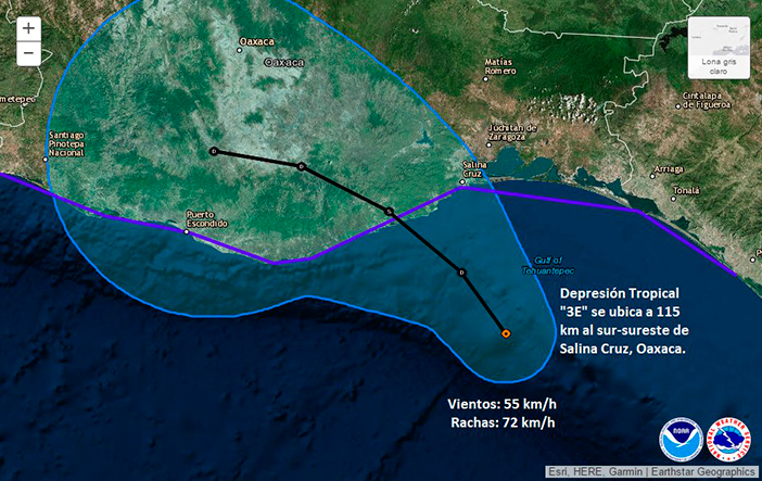 Conagua alertó que el sistema ciclónico presenta condiciones favorables para seguir intensificándose y se espera se localice a las 19:00 horas a 35 km al este de Bahías de Huatulco y 65 kilómetros al este del Puerto Ángel, Oaxaca.