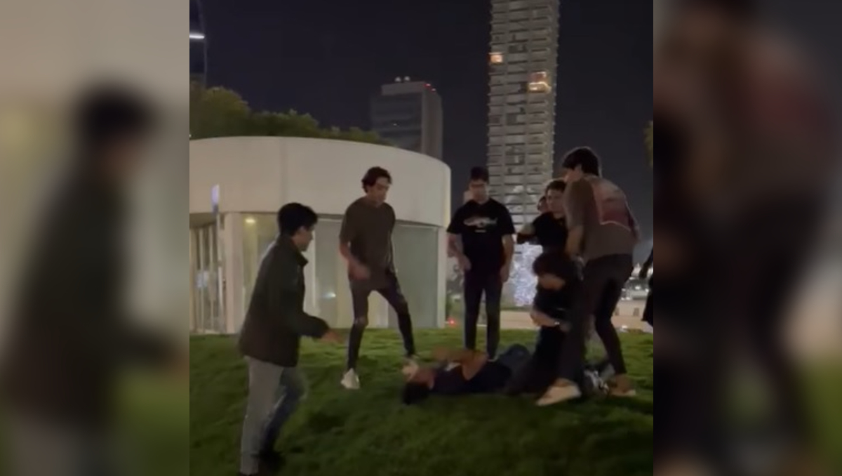 En el video, se puede ver a un joven tirado en el piso en un área verde cerca de la Estrella, en Angelópolis, Puebla, a su alrededor hay ocho hombres en supuesto estado de ebriedad que lo están golpeando con las manos, cerca del segundo 10, uno de ellos le propinó una patada en la nuca que lo hizo contorsionarse de dolor y luego se quedó quieto en el piso mientras se cubría la cabeza.
