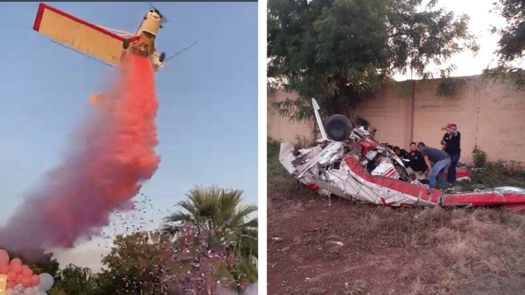 La caída de la aeronave quedó captada en video, pues una persona invitada a la celebración grabó el instante en que, después de sobrevolar el área y dejar caer una sustancia color rosa, un ala del vehículo se rompió e hizo que el piloto perdiera el control.