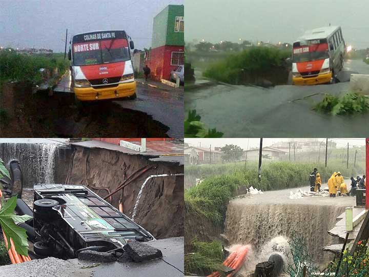 Veracruz, 7 Julio.- Un camión de pasajeros cayó en socavón ocasionado por las fuertes lluvias, en las calles del Fraccionamiento Oasis, Veracruz.