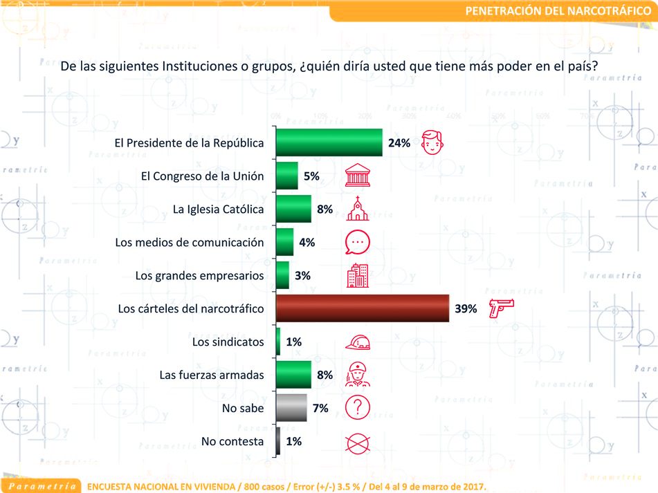 Realizada en marzo pasado, la encuesta reveló que el 39% de los encuestados, es decir, 4 de cada 10 mexicanos, piensa que los cárteles del narcotráfico son el grupo con mayor empuje y fuerza en el país, seguidos por el presidente de la República con un 24% de las menciones.