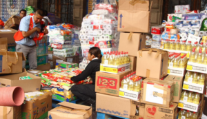 Por medio de cadenas humanas la ayuda empieza a agilizarse rapidamente para separar los productos que son comida enlatada, papel de baño y servilletas, así como todo lo que sirva para las labores de rescate.