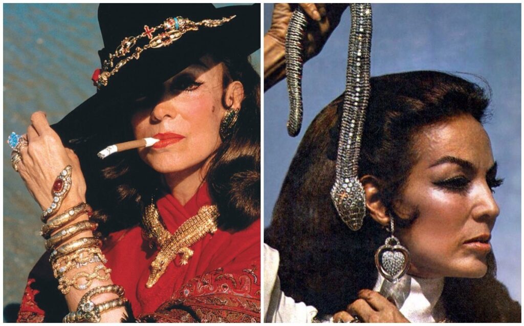 No solo es conocida por su personalidad dominante, fuerte e intensa. También por su inigualable belleza, su talento, porte y sus extravagantes joyas, como los icónicos cocodrilos en diamantes y esmeraldas.