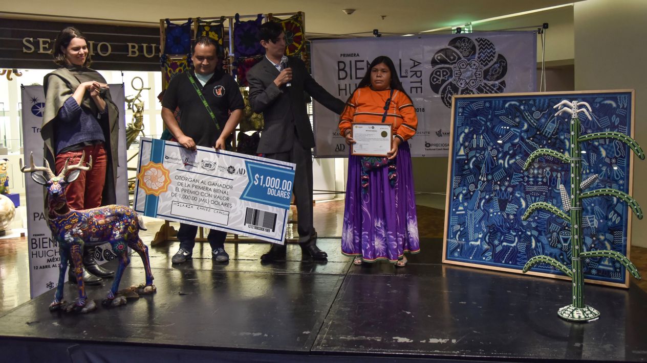 Ciudad de México, 11 Julio.- La premiación de la Primera Bienal de Arte Huichol, un encuentro antropológico, artístico, cultural, académico y étnico, se lo llevó Hilaria Chávez con una pieza original titulada «Tabla del nacimiento del mundo».