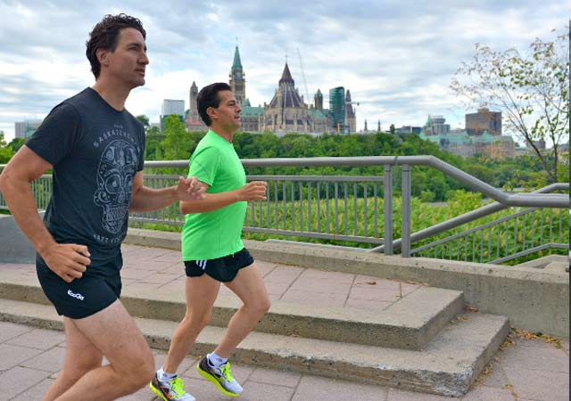 Trudeau, con short y playera negra, y Peña Nieto, con short negro y playera verde, trotaron por el puente cerca del clásico hotel Chateau Laurier. Al cruzar el puente siguieron su recorrido por Gatineau, Quebec, acompañados por una decena de guardias de seguridad.