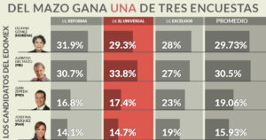 Sin embargo el promedio de las tres encuestas dan a Alfredo del Mazo un porcentaje del 30.5 y a Delfina uno de 29.73. Por otro lado Juan Manuel Zepeda Hernández, el abanderado del Sol Azteca ocupa el tercer lugar con el 16.8 por ciento lo que posiciona a la panista Josefina Vázquez Mota en el cuarto lugar con tan solo el 14 por ciento.