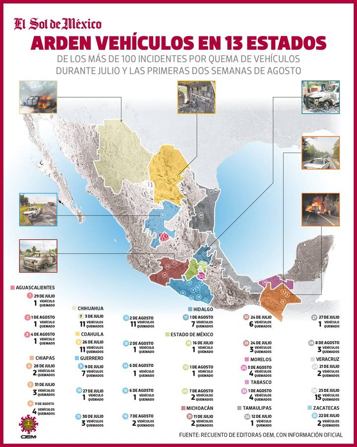 Según una revisión realizada por Organización Editorial Mexicana (OEM), Guerrero es la entidad con más unidades siniestradas, al registrar 27, principalmente en Acapulco y las regiones Centro y Montaña Baja. En segundo lugar se ubicó Veracruz con 17 y en tercer puesto Chihuahua, con 12 siniestros.