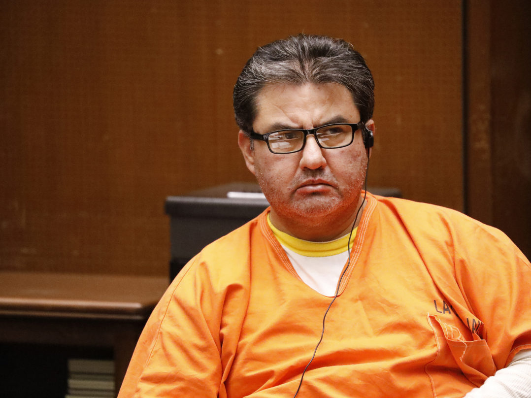 Naason Joaquin Garcia, the leader of a Mexico-based evangelical church with a worldwide membership, appears with his defense attorneys Ken Rosenfeld and Allen Sawyer for a bail review hearing in Los Angeles Superior Court on Monday, July 15, 2019. Prosecutors have asked a judge to hold Garcia without bail on charges of child rape and human trafficking. (Al Seib/Los Angeles Times via AP, Pool)