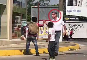 En el video se puede apreciar como el hombre le grita y forcejea con el niño para arrebatarle la mercancía que vendía, a lo que el menor alerta de que lo están robando.