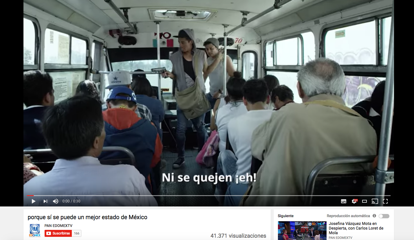 En el mensaje se muestra un asalto que tiene lugar en el transporte público y el diálogo corre por parte del mismo delincuente quien dice a los pasajeros que no tienen porque quejarse pues «seguro votaron por el PRI, que se olvidó de ustedes»