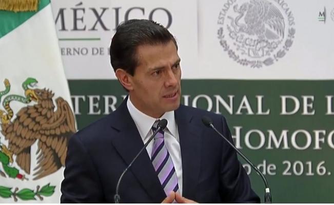 El anuncio lo hizo acompañado por los secretarios de Gobernación, de Relaciones Exteriores, de Salud y de Educación, durante la ceremonia realizada en Los Pinos, con motivo del Día Internacional de Lucha contra la Homofobia.