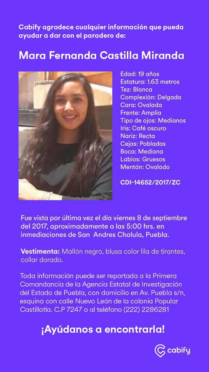 Puebla, 12 Sept.- Hace tres días se reportó la desaparición de la joven Mara Fernanda Castilla, luego de abordar un vehículo de la empresa Cabify.