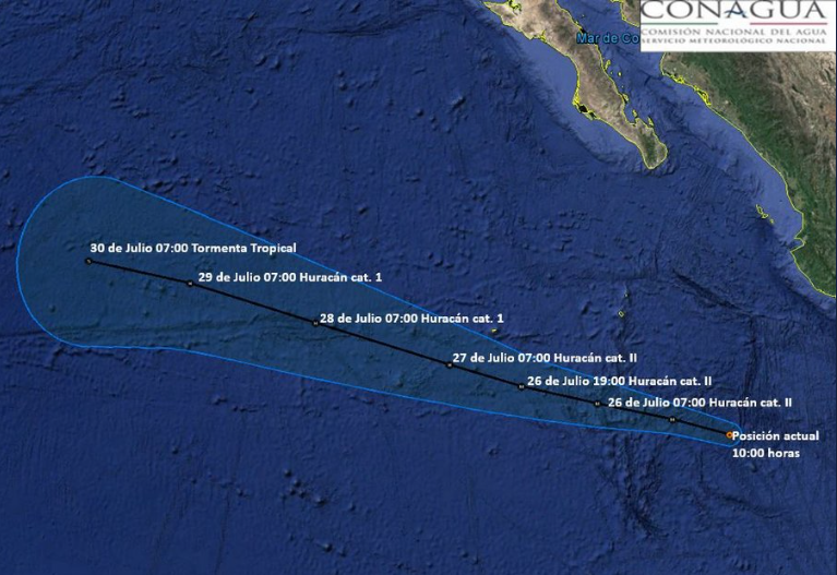 Detalló que el meteoro se ubica a 505 kilómetros al sur-suroeste de Manzanillo, Colima; a 575 kilómetros al sur de Cabo Corrientes, Jalisco, y a 870 al sur-sureste de Cabo San Lucas, Baja California Sur.