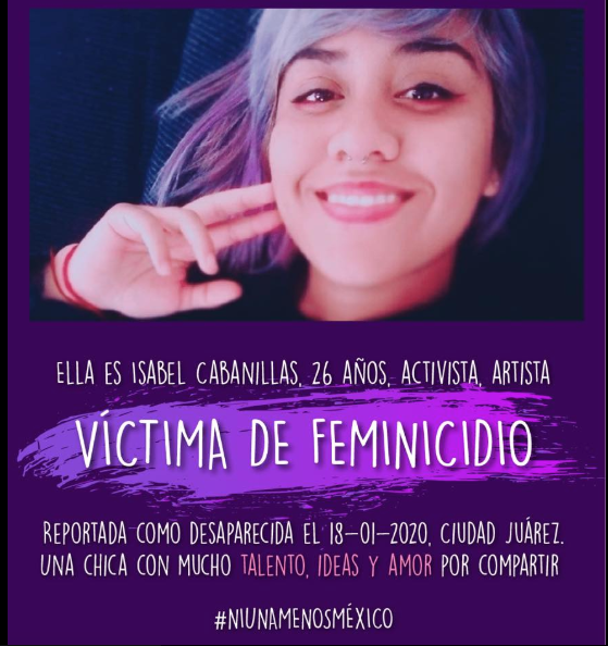 Isabel Cabanillas de la Torre de 26 años era artista plástica, diseñadora de ropa, pintora y promotora de los derechos de las mujeres donde era parte del miembro activo del colectivo “Hijas de Nuestra Maquilera Madre” y también había participado en la red Mesa de Mujeres, pero el domingo 19 de enero 2020 fue asesinada en Ciudad Juárez luego de estar desaparecida por varias horas.