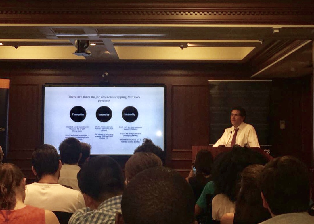 Ciudad de México, 19 Septiembre.- El senador independiente Armando Ríos Piter sostuvo un encuentro con la comunidad estudiantil de la Universidad de Georgetown, en Washington D. C. para abordar la ponencia “The future of México” donde expresó, que los tres principales obstáculos que frenan el progreso del país, son: la corrupción, la inseguridad y la desigualdad.