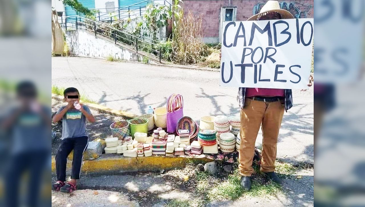 Una fotografía que se viralizó en internet muestra cómo un artesano sostiene una cartulina en su lugar de venta de artesanías en plena banqueta en la que dice que las cambia por útiles escolares.