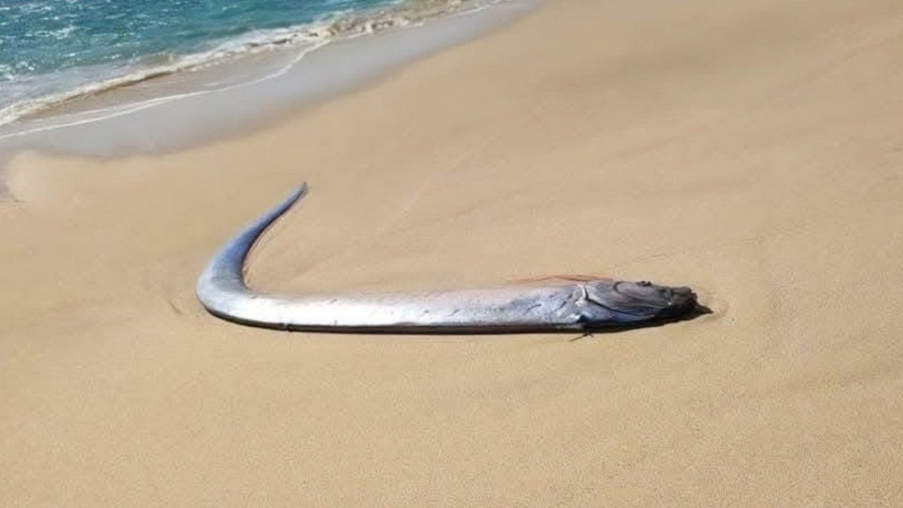 En las imágenes se puede ver a un pez remo, una especie que habita a profundidades de entre 200 y mil metros, emergiendo sorpresivamente en la costa. Un fenómeno que incluso está relacionado a múltiples leyendas y supersticiones entre pescadores que relacionan su aparición en la orilla del mar con desastres naturales.