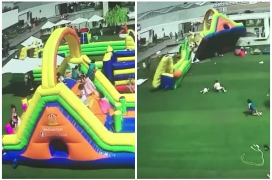 Una cámara de seguridad captó el momento en el que tres juegos inflables con todo y niños salieron volando por una ráfaga de viento al norte de la ciudad. Cuatro menores salieron heridos, uno de ellos de gravedad.