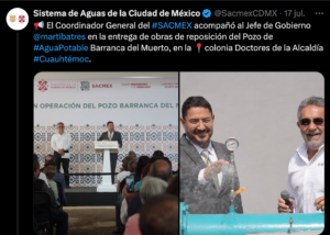 El Sistema de Aguas de la Ciudad de México (SACMEX), representado por su Coordinador General, Dr. Rafael Carmona Paredes, entregó los trabajos de sustitución del Pozo Barranca del Muerto en la colonia Doctores, alcaldía Cuauhtémoc. La obra, con una inversión de 17.6 millones de pesos, beneficiará a 26 mil habitantes.