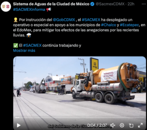 Mediante un comunicado conjunto con el Gobierno de la Ciudad de México, SACMEX informó que su personal se movilizó al municipio de Chalco, llevando equipos de bombeo para asistir en las colonias Culturas de México, en calles como Tezcatlipoca, Chalchihueiticue, Tlaxcaltecas, Purépechas y Yaquis.