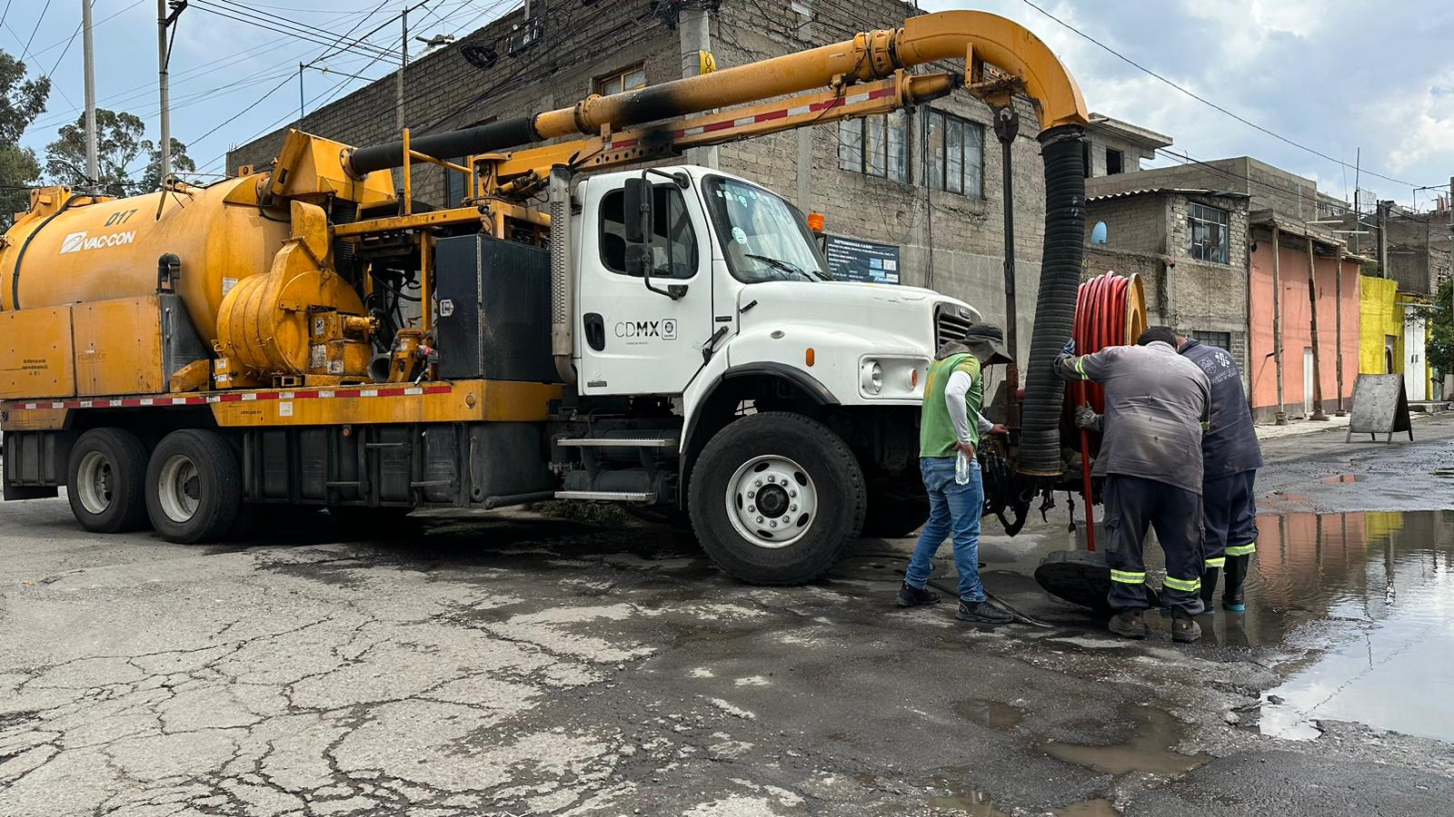 En tanto, dos vehículos hidroneumáticos tipo vactor realizan labores en el pozo de visita localizado dentro de instalaciones de protección civil. Un equipo hidroneumático más realiza el sondeo de la atarjea en las Calles 10 de Abril y 30 de Mayo, y uno más en calle 20 de Marzo, entre Benito Juárez y 5 de Mayo, en la colonia Jacalones.