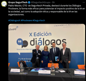 Pablo Maiolo, CTO de Seguritech Privada, fue uno de los ponentes más destacados con su intervención titulada “Implicaciones Sociales de la Inteligencia Artificial: El Futuro del Empleo, la Salud y la Economía”. Durante su charla, Maiolo profundizó en cómo maximizar los beneficios de la IA en la sociedad, subrayando la importancia de una adopción ética y responsable en las organizaciones.