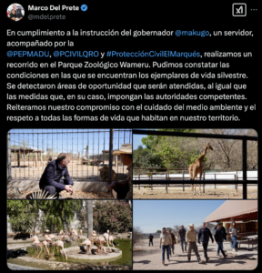Tras diversas denuncias en redes sociales sobre el estado de las instalaciones y los ejemplares del Parque Zoológico Wameru, autoridades estatales de Querétaro han llevado a cabo un recorrido para evaluar la situación y garantizar el bienestar de la fauna en el lugar. El recorrido fue realizado bajo la supervisión del secretario de Desarrollo Sustentable, Marco Del Prete, acompañado por el titular de la Procuraduría Estatal de Protección al Medio Ambiente y Desarrollo Urbano (PEPMADU), José Luis Peña Ríos. También participaron los coordinadores de Protección Civil del Estado, Javier Amaya Torres, y del Municipio de El Marqués, Alejandro Vázquez Mellado.
