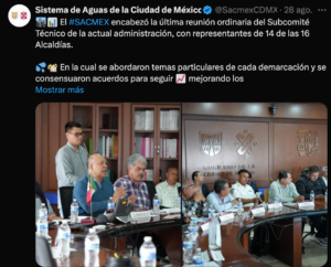 El Sistema de Aguas de la Ciudad de México (SACMEX) y las diversas alcaldías de la capital, revisaron los avances, proyectos y logros alcanzados en 2024, en materia de mejora en los servicios hidráulicos, reconociendo la importancia del trabajo conjunto en favor de la atención oportuna a peticiones en materia de agua potable y drenaje.