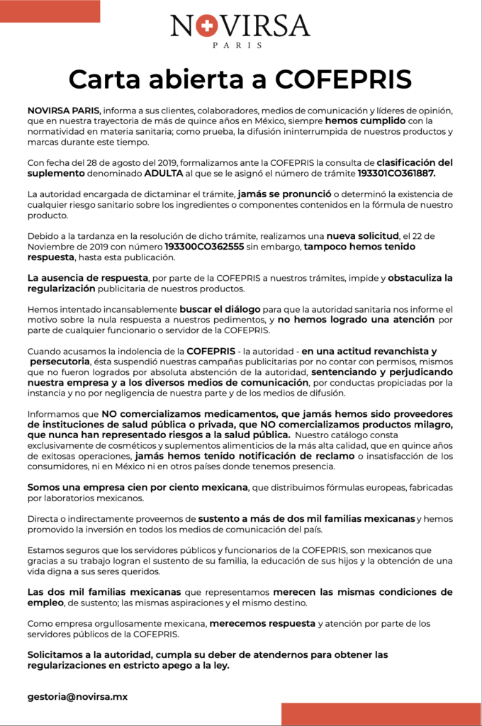 Novirsa ha buscado el diálogo sin éxito luego COFEPRIS suspendió sus campañas publicitarias por falta de permisos, mismo que no se lograron por absoluta abstención de la autoridad, lo que ha perjudicado a esta empresa.